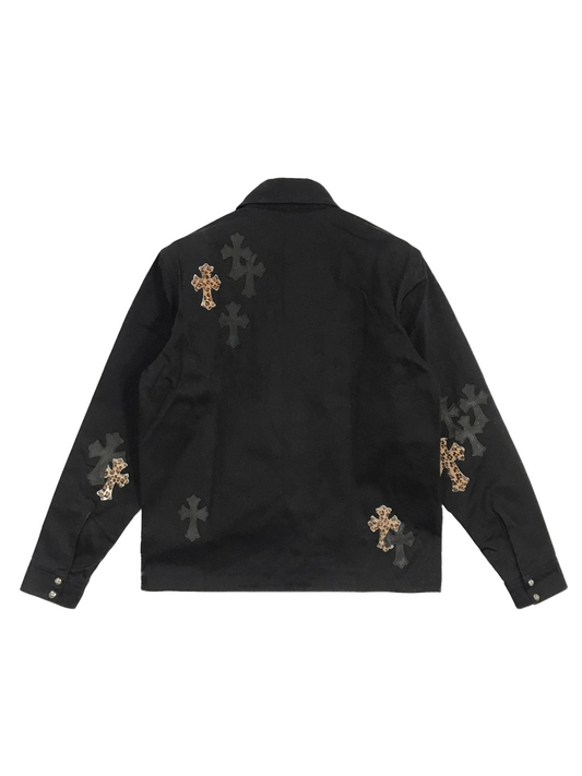Chrome Hearts Work Dog Leopard Pattern & Black Leather Cross Patch Shirt Jacket Black with Silver Buttons
