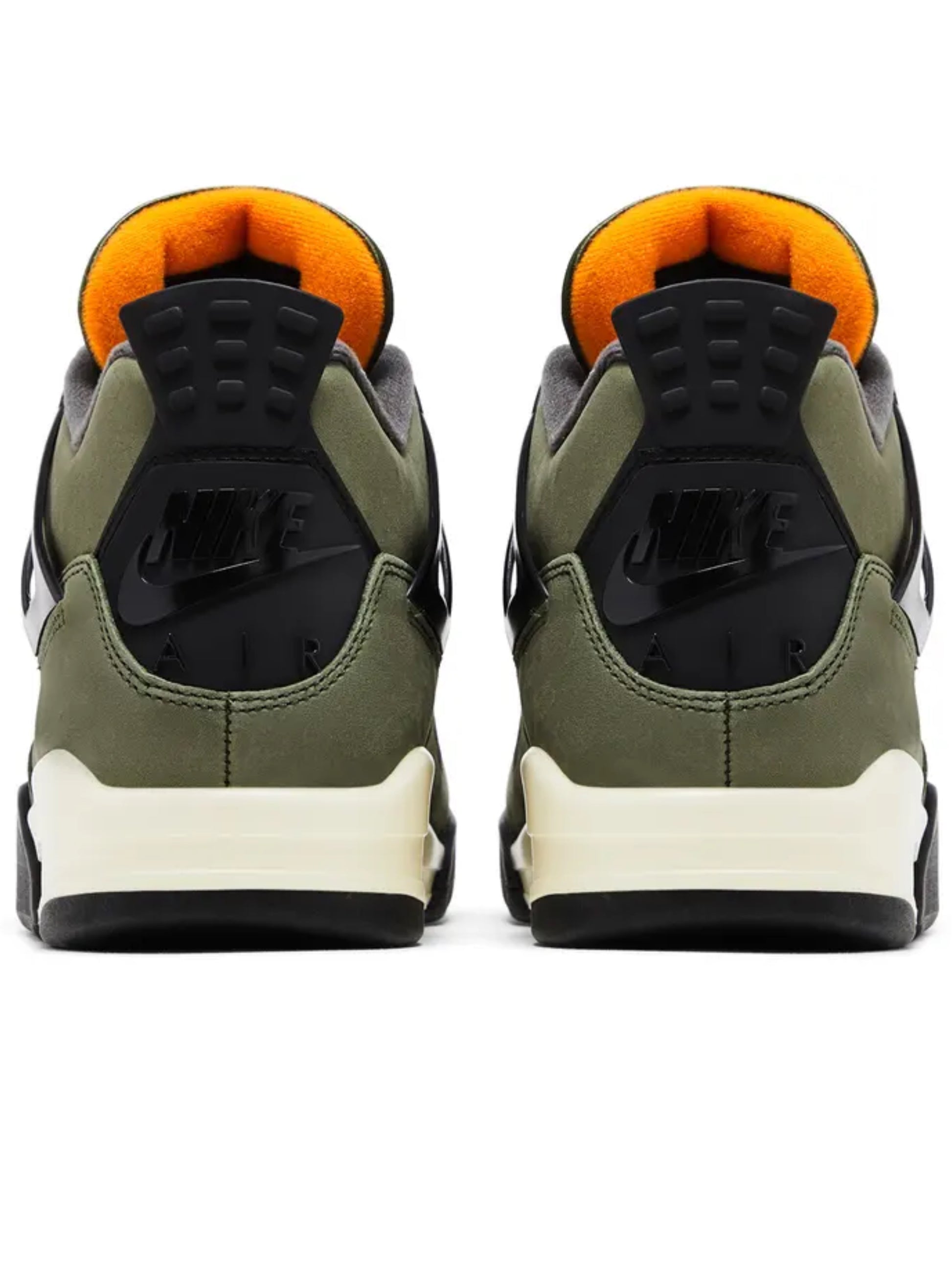 The 2025 reissue of the Undefeated x Air Jordan 4 brings back the highly coveted collaboration that initially dropped in 2005 in a limited run of 72 pairs. Inspired by an MA-1 flight jacket, the classic silhouette sports an olive green nubuck upper with contrasting black accents on the molded eyelets, TPU supports wings, and back tab, marked with a Nike Air logo. Velcro logo patches adorn the tongue, lined with vibrant orange textile on the interior side. The sneaker rests on an off-white polyurethane midsole with a visible orange-tinged Air unit in the heel.
